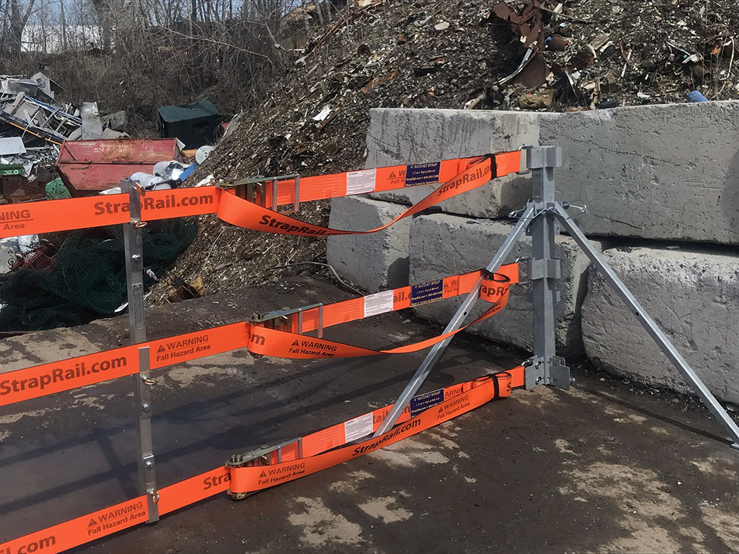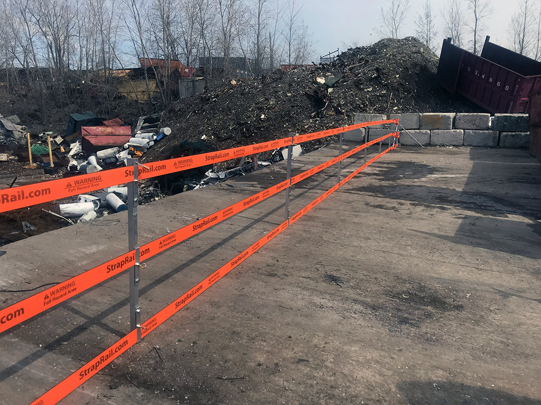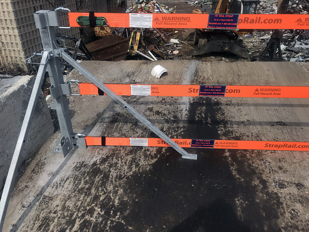 Deitcher & Frère LaSalle, QC, CANADA   Système Garde-Corps StrapRail® (4 pieds d’hauteur) avec Poteaux à Angles Ancrés boulonnés, Sangles oranges StrapRail®, Poteaux Anti-Flexion et cadenas ABUS (pour sécuriser les cliquets et les poteaux).