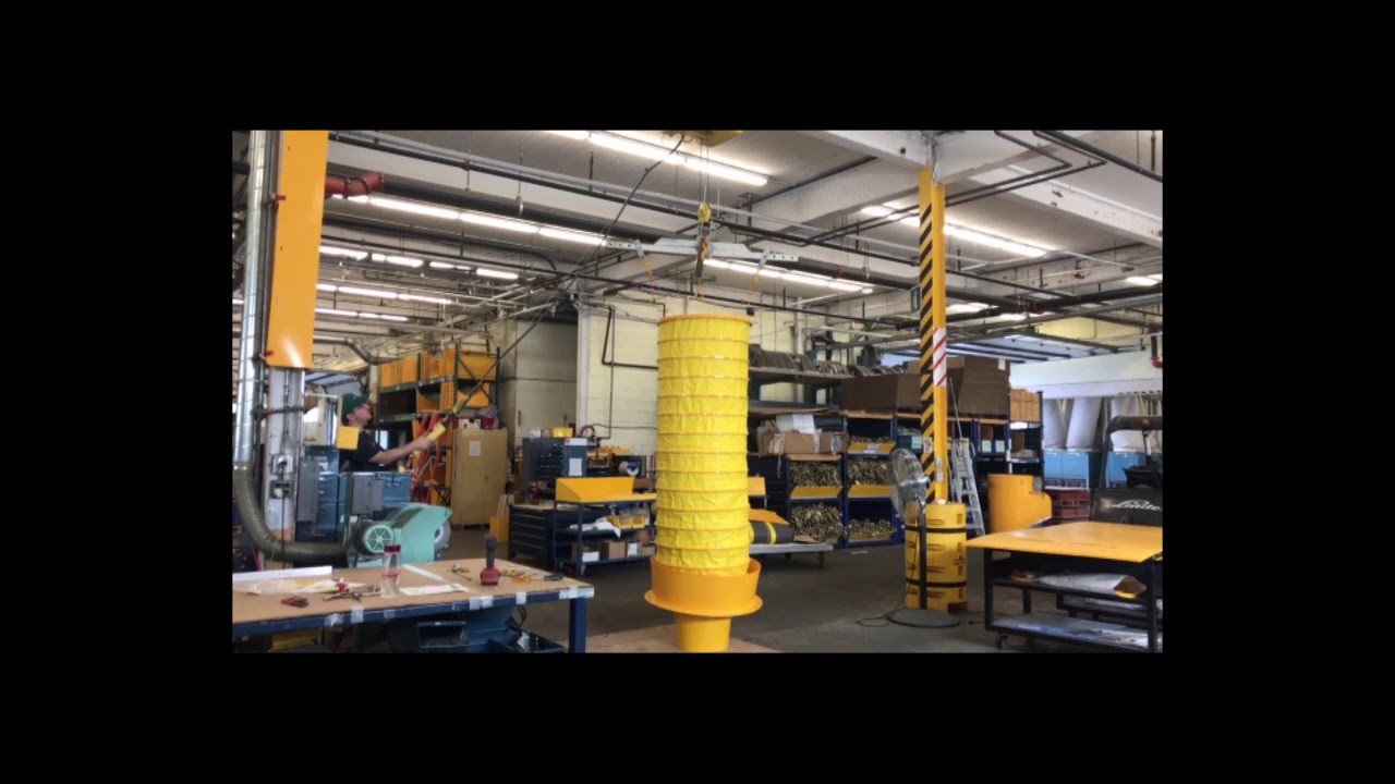 ADM Lincoln, NE, USA Nesting Chute Cones (HMWPE) and Retractable Canvas Shroud (16″ dia x 7′ long) with Plastic Top Supporting Lifting Collar with Mounted Discharge Flange. Video on bottom showing test lifting and lowering.