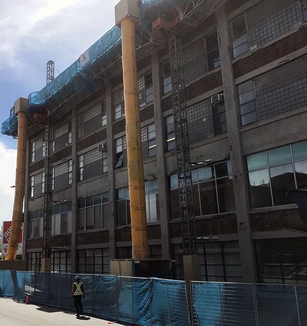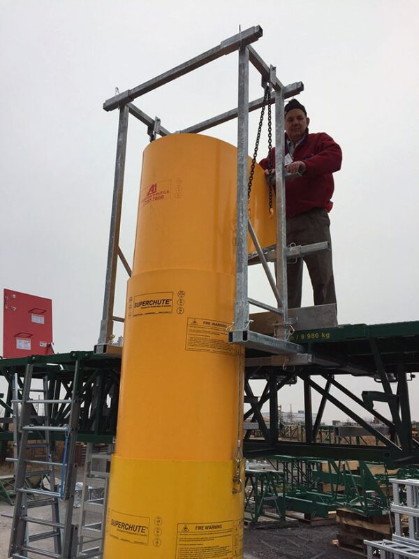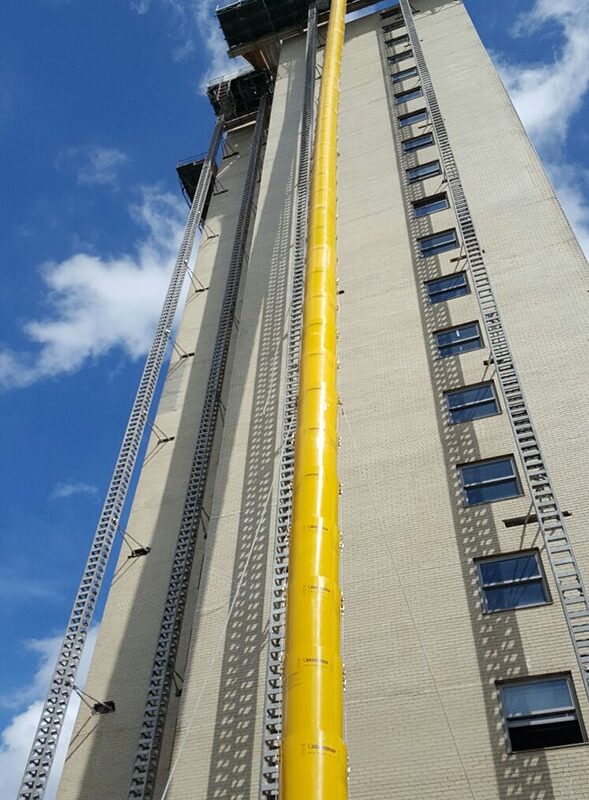 Asbestos Removal Project Right hand chute is wrapped in white plastic film to contain airborne asbestos dust.