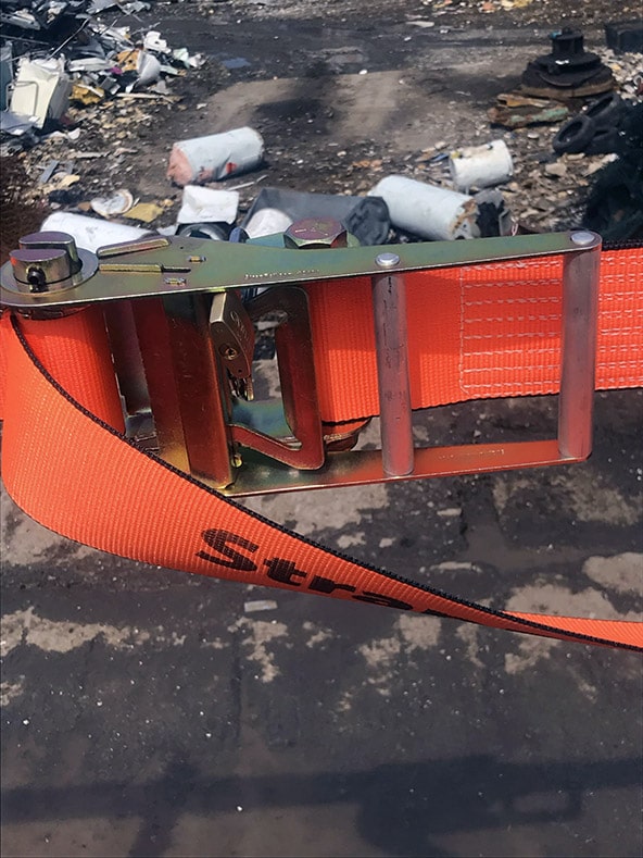 Deitcher & Frère LaSalle, QC, CANADA   4′ Tall StrapRail® GuardRail System with Bolted Steel Corner Anchor Posts, Orange Rail Straps, Aluminum Anti-Deflection Posts & ABUS Padlocks (to secure ratchets & posts).